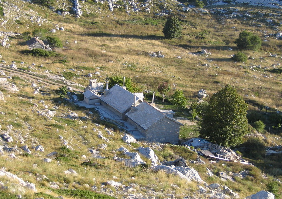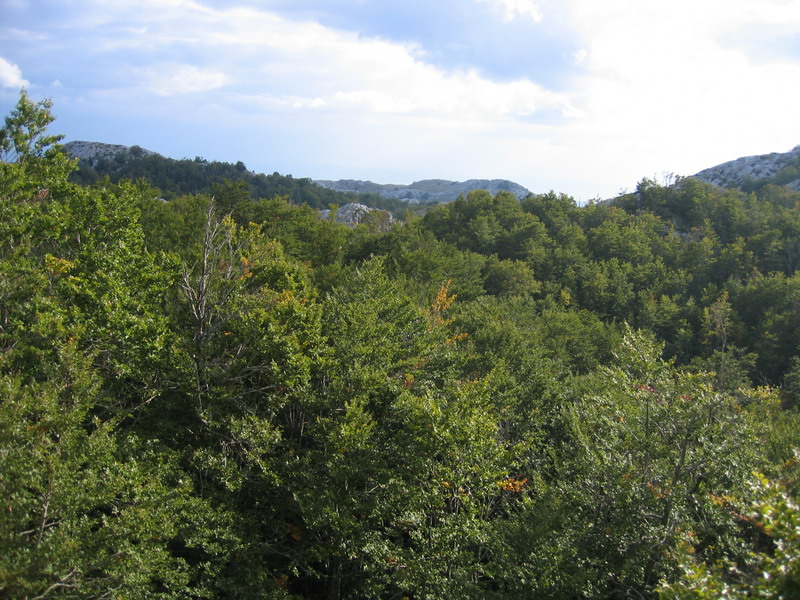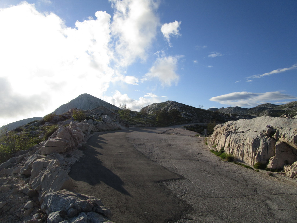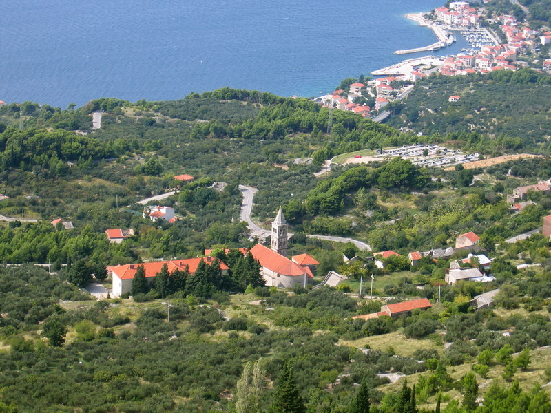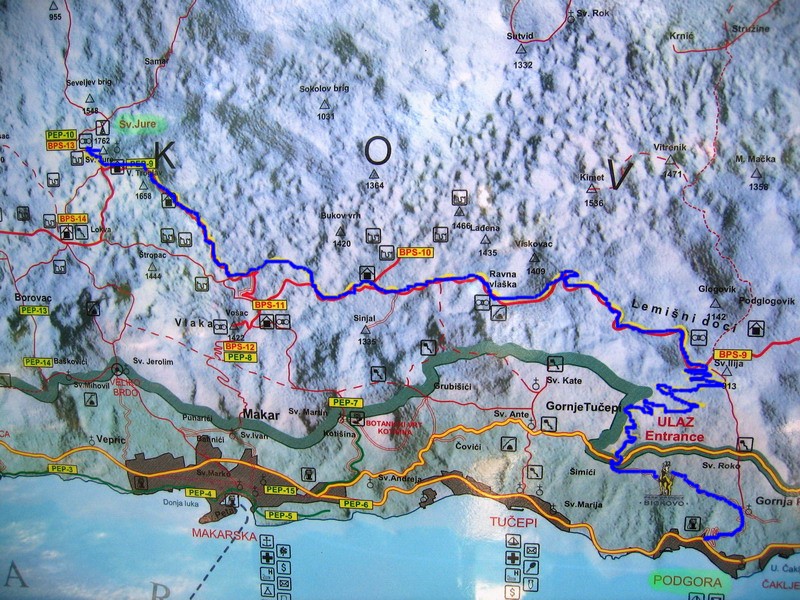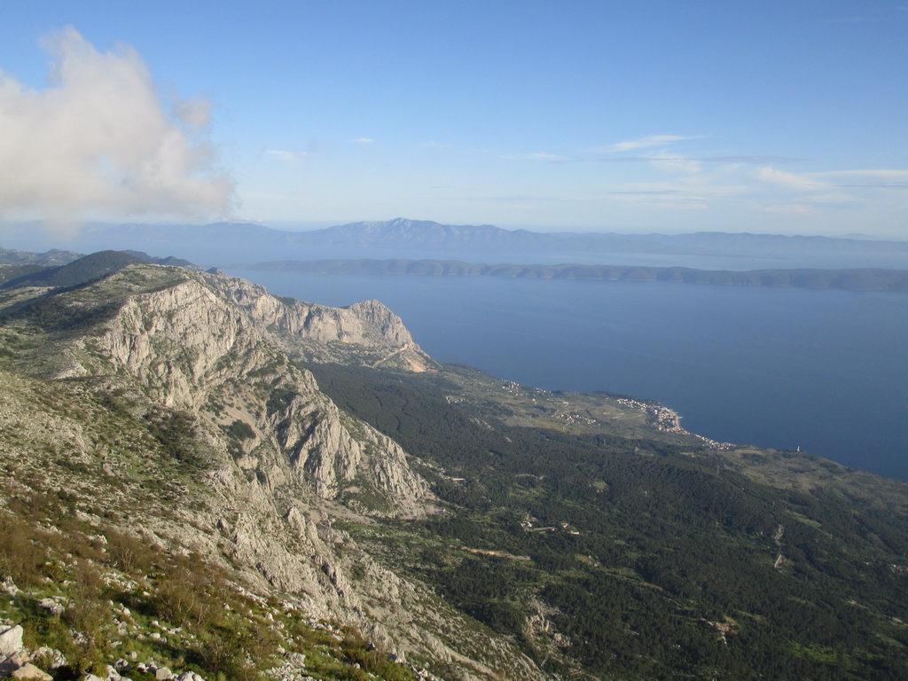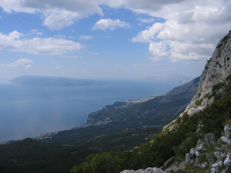 Po zaplatení vstupného sme pokračovali ďalej. Cesta v borovicovom lese naberala výšku pomaly a tak sme mohli šetriť sily a vychutnávať si okolie. Rušili nás len autá a viacero mikrobusov s turistami, ktorí si zaplatili za vyvezenie sa hore. Tam si pozrú výhľady, vygr..jú sa a zase sa zvezú dole. Vychádzame z lesa, serpentíny sa skracujú a cesta je stále strmšia. Otvárajú sa nám nádherné výhľady na riviéru Makarskej a ostrovy Brač a Hvar. Serpentíny končia v sedle Staza (880m.) Tu je aj posledná možnosť občerstvenia v malej reštaurácii. My máme zásoby zo sebou a pokračujeme ďalej. Vychádzame na planinu, kde sa stúpanie trošku zmierni, miestami sú aj rovinky. Na planine sú vidieť malé políčka a staré kamenné domčeky. Na lúčkach sa tu voľne pasú kone, nie sú dokonca ani zavreté v žiadnych ohradách. Celá krajina má krasový charakter a je tu vidieť rôzne jamy, prepadliská a skalné útvary opracované vodou.