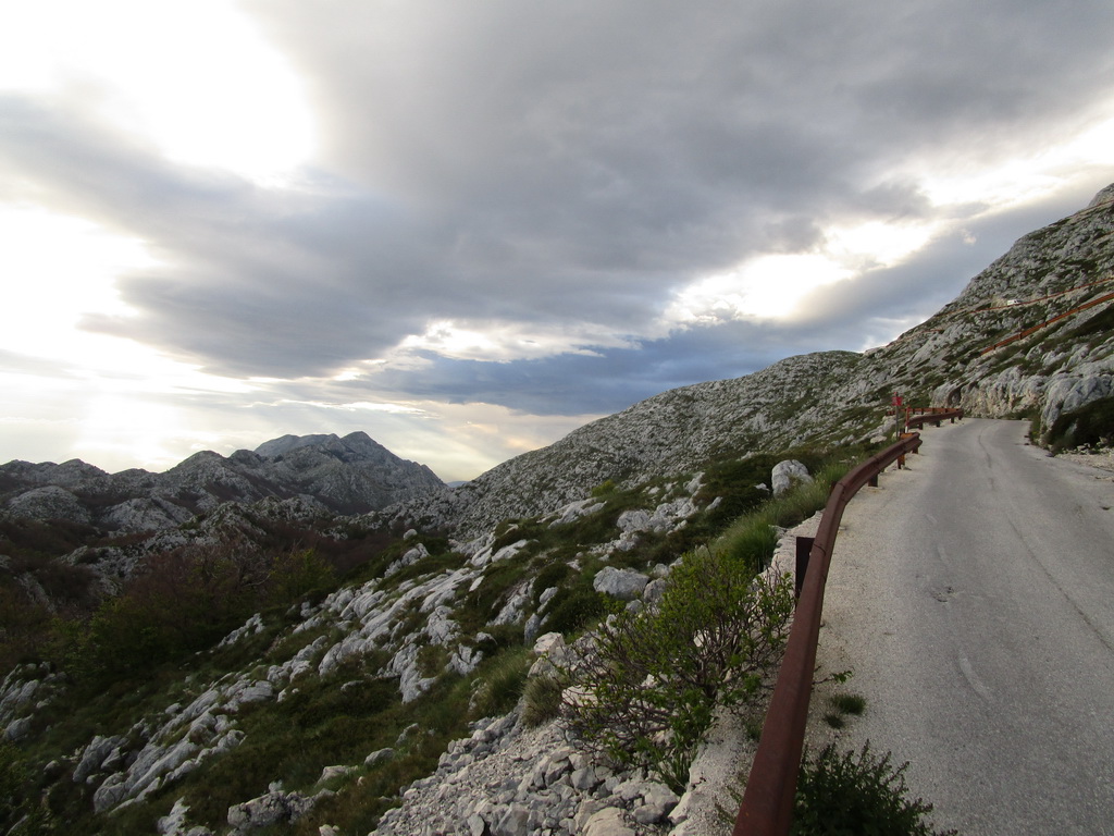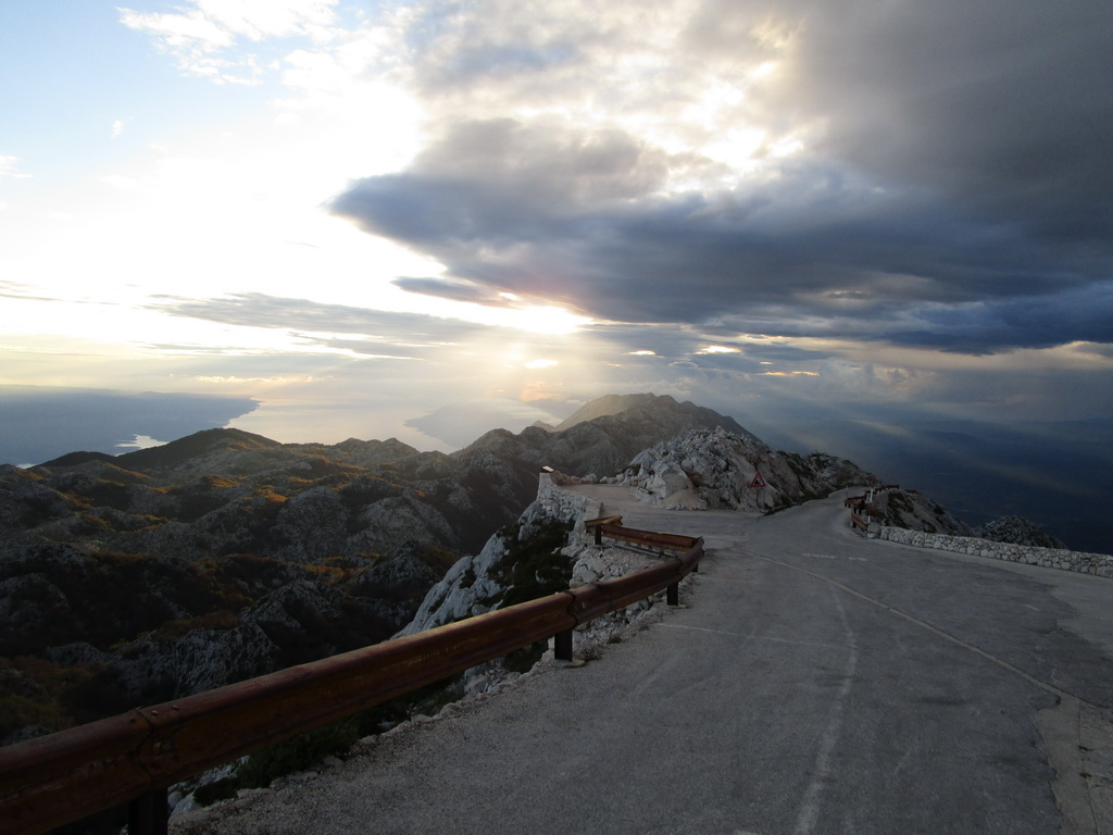 Po pár kilometroch zjazdu sa dostávame spod čiapky oblakov a na planine nás zohreje teplý vzduch. Vychutnávame si zjazd a zastavujeme kvôli výhľadom. Slnko sa pripravuje skryť za morskú hladinu a my si vychutnávame serpentíny na vyprázdnenej ceste. Do Podgory prichádzame presne v čase západu slnka, ešte ho stihnem aj vyfotiť...