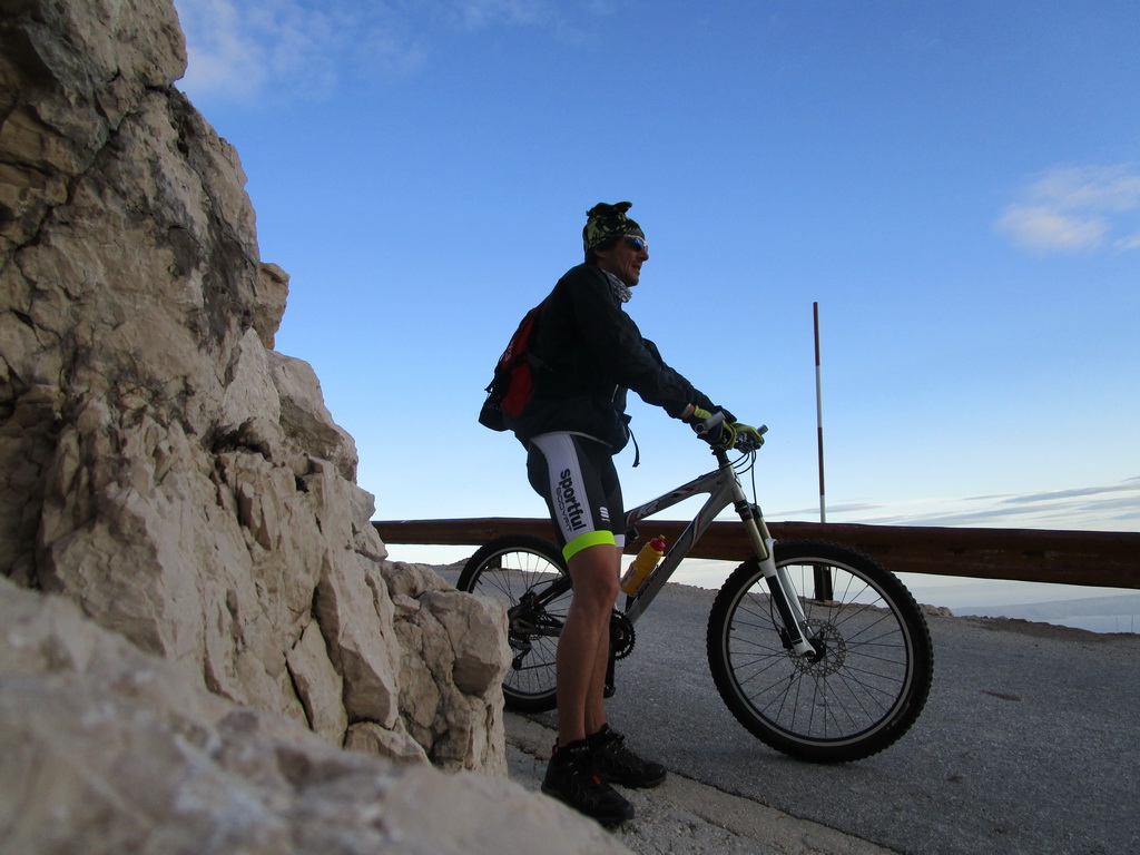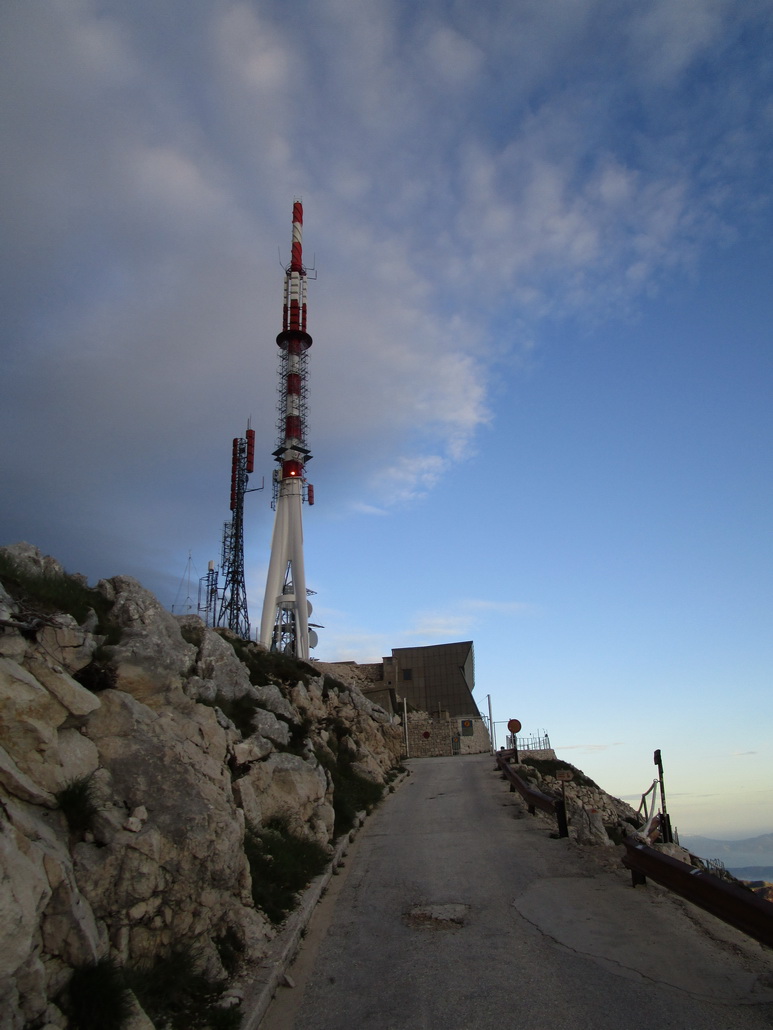 Citeľne sa ochladilo a pri zdolávaní posledných serpentín sa už moc nezohrejeme. Na vrchu nie je žiadna možnosť občerstviť sa, alebo ukryť sa v nejakom prístrešku. Dáme vrcholové foto a rýchlo sa chystáme na zjazd. Je tu teplomer, ktorý ukazuje nepríjemných 11 stupňov. Prišli sme sa k moru zohriať a teraz toto. Ešte si vypýtame od Čechov , ktorí su autom igelitový sáčok. Roztrhnutý si ho strčím pod dres a hurá dole.