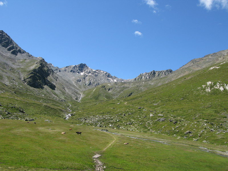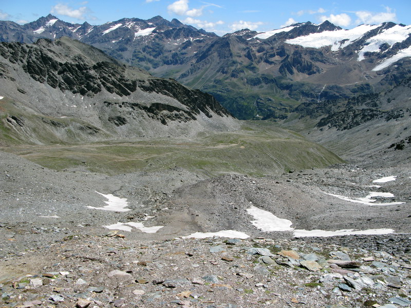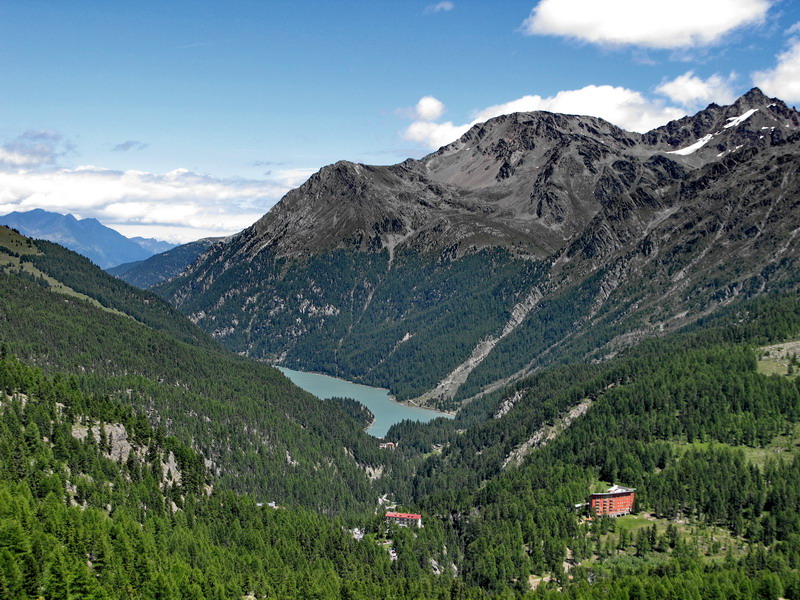 V závere doliny chodník prechádza popri vysokohorskej chate Zufallhütte. Tu som sa zastavil občerstviť sa a pokračoval po peknom a ťažkom chodníku dole, na rázcestí asi 1 km pod chatou si môžete predĺžiť zjazd odbočkou vpravo. Pri budove staršieho a odstaveného hotela však odporúčam napojiť sa už na cestu. Ja som totiž skúšal ísť ďalej po turistickom chodníku, ale viac som tlačil ako jazdil. Priehrada sa síce dá obísť po štrkovej ceste sprava, ale potom sa po priehradnom múre vráťte na hlavnú cestu. Ja som v očakávaní dobrého zjazdu pokračoval po chodníčku č.36 a moc sa mi to nevyplatilo. Aj napriek pár pekným úsekom som zase viac tlačil ako jazdil. Vzhľadom na dĺžku a náročnosť celého okruhu je lepšie v Martelltali už moc nešpekulovať a pustiť sa jednoducho dole po hlavnej asfaltke.V závere doliny treba odbočiť na Morter, tam vás už značky navedú na cyklotrasu vedúcu dolinou Vinschgau. Tu sa po peknej cestičke (bez áut), vedúcej popri rieke a obklopenej hustou zeleňou, dá dostať až do Pradu (dobre značené). Odtiaľ začína už spomínané stúpanie do Suldenu cez dedinku Gomagoi (začiatok stúpania na passo Stelvio).
